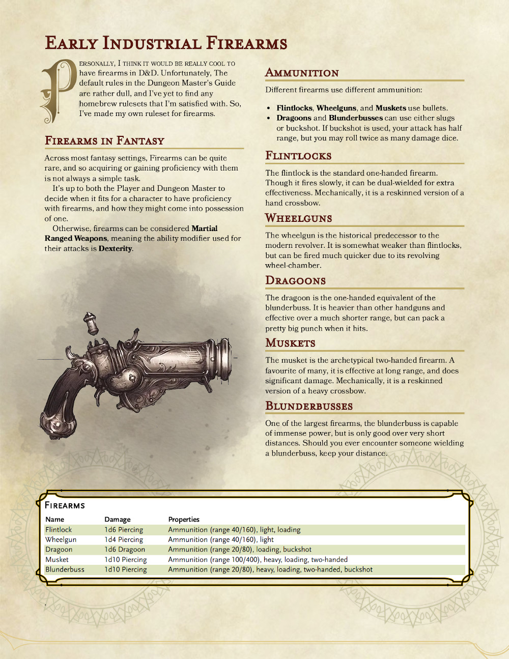 Personally, I think it would be really cool to have firearms in D&D. Unfortunately, The default rules in the Dungeon Master's Guide are rather dull, and I've yet to find any homebrew rulesets that I'm satisfied with. So, I've made my own ruleset for firearms.