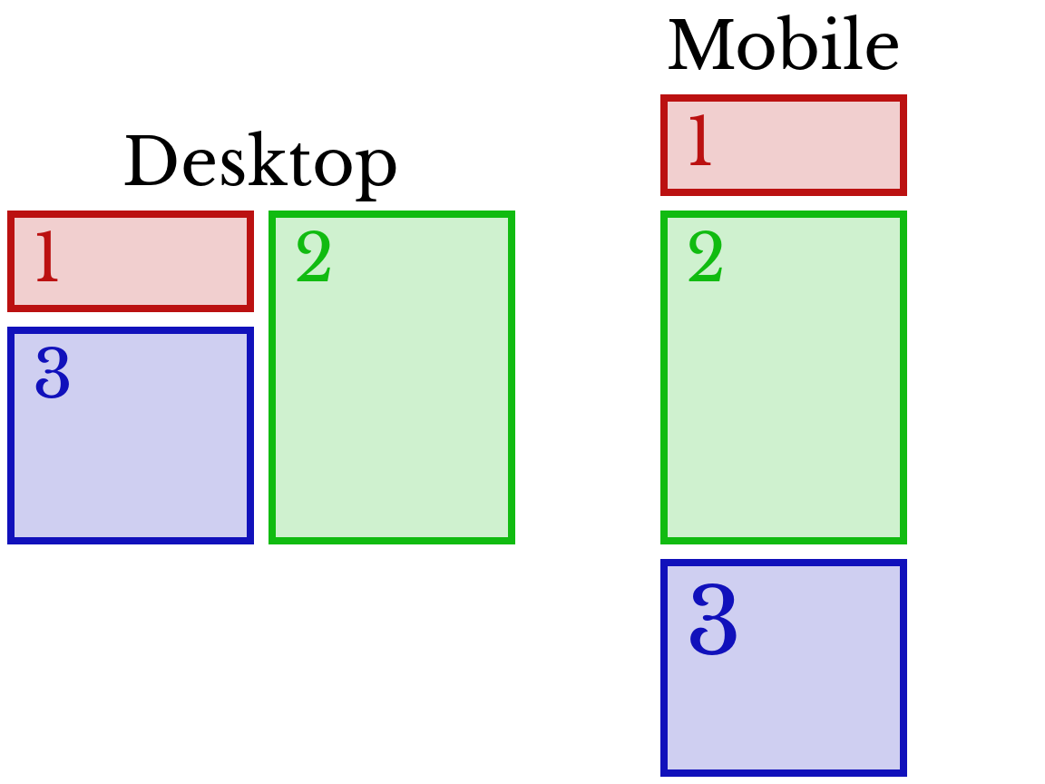 Well, throughout these renovations, I've been toying around with CSS flexbox. I realised I could use a flexbox with the flex-wrap property to split content over seperate columns, and then use the order property on each section to specify whether it should go to the left or the right.